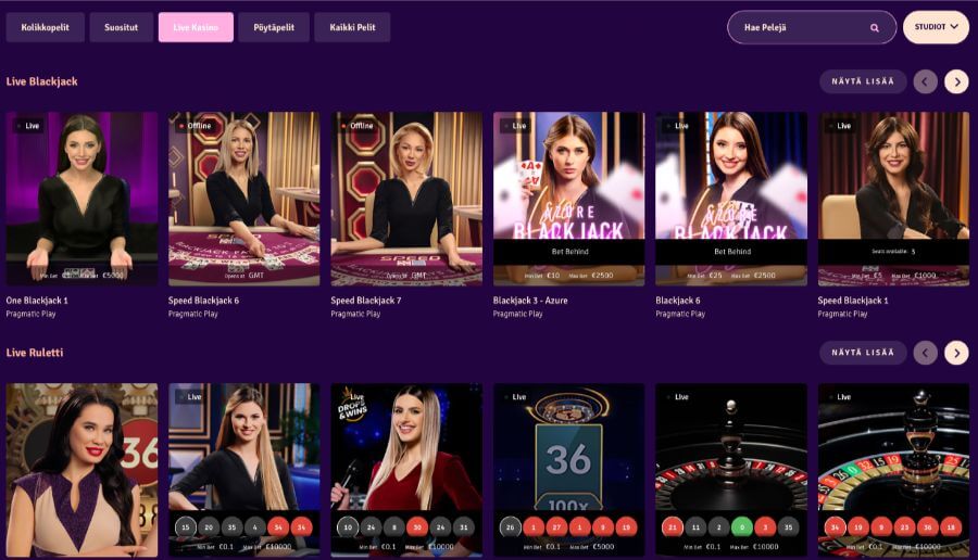Livekasinolla on tรคtรค arvostelua kirjoittaessani karkealta arviolta noin muutaman sadan pรถydรคn valikoima. Blackjackit, ruletit ja viihdepelit lรถytyvรคt omista kategorioistaan, kun taas muita pelejรค, kuten baccarateja ja pokereita on hieman nihkeรคsti etsittรคvรค hakutoiminnolla.