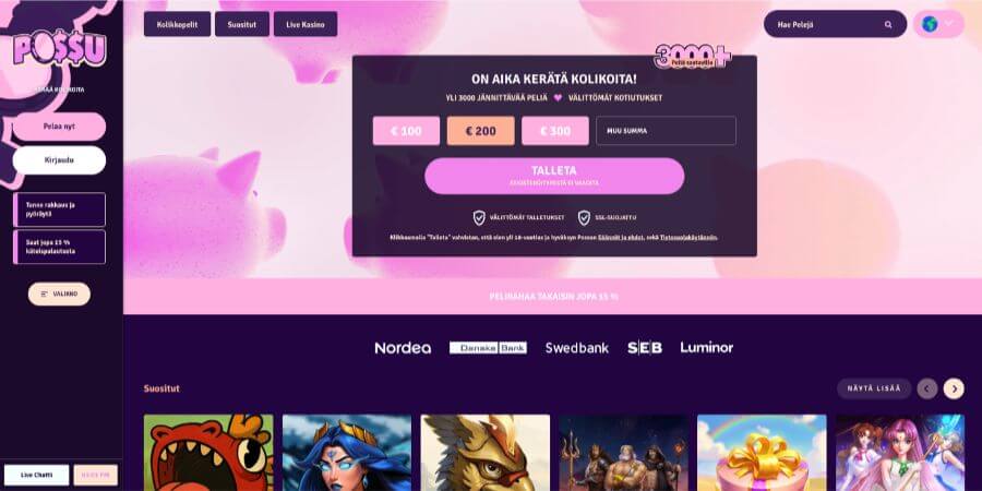 Tรคmรคn kasinon ehdoton vetonaula on nopeat verkkopankkimaksut, mutta myรถs euron minimitalletus, jonka ansiosta Possu Casinon testaaminen on matalan kynnyksen takana. Sivut ovat siistit niin tietokoneella kuin mobiilissa, mikรค tekee pelikokemuksesta kokonaisuudessaan vaivattoman.