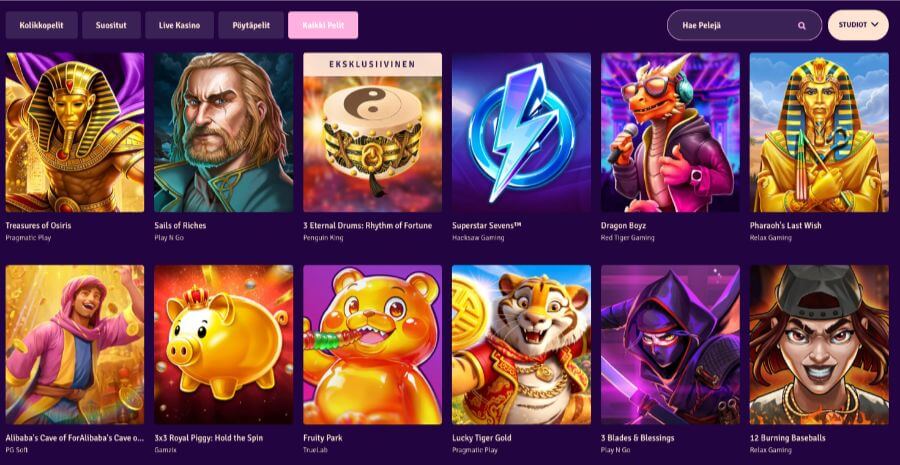 Kasinon kolikkopeleihin sisรคltyy perinteisiรค videokolikkopelejรค, ostobonuspelejรค ja Megaways-pelejรค. Nรคiden lisรคksi uutuudet, Drops & Wins -pelit sekรค Book of -sarjan pelit lรถytyvรคt myรถs kivasti omista kategorioistaan.