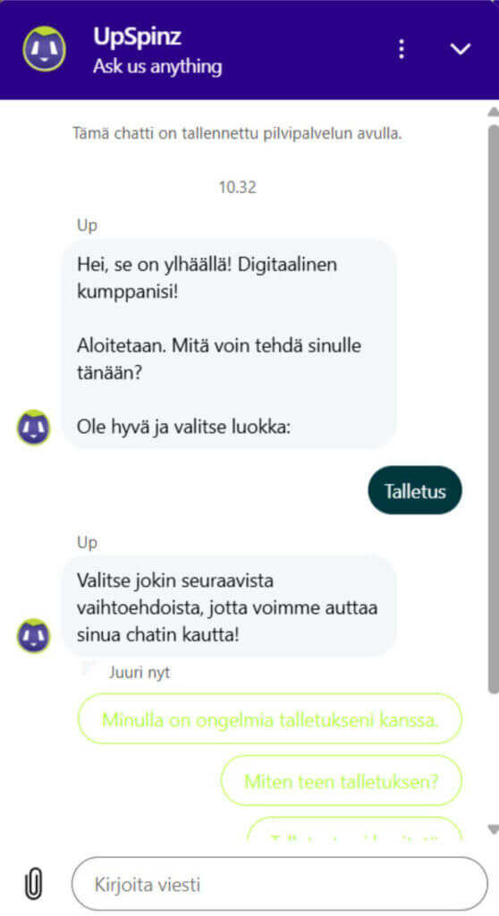 UpSpinzin asiakaspalvelu on nopea ja tehokas, mutta ainakin omalta osaltani vierastan vähän näitä tekoälybotteja. Onhan ne varmaan suunniteltu toteuttamaan kaikki asiakkaan toiveet, mutta jotenkin olisin halunnut että meikäläistä palvelee oikea asiakaspalvelija.