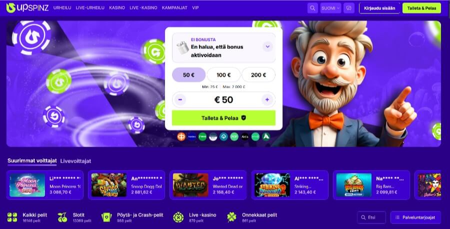 UpSpinz kasino kokemuksia ja nappaa talletusbonukset aina 1500€ saakkaUpSpinz on suomalaisille kasinopelaajille suunnattu sivusto, joka tarjoaa Pay n Play -pelaamisen lisäksi myös rekisteröitymisvaihtoehdon. Curacaon pelilisenssi tuo turvallisen pelaamisen, mutta verolliset voitot. Tutustuin arvostelussa UpSpinz kasinon toimintaan, pelivalikoimaan ja sen ensitalletusbonukseen.