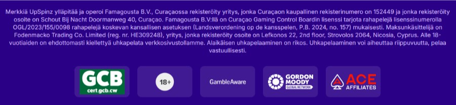 UpSpinz toimii Curacaon peliviranomaisten myöntämällä lisenssillä. Pelaajan kannalta se tarkoittaa yleensä vähemmän vastuullisen pelaamisen työkaluja ja sitä, että voitot ovat verollisia.