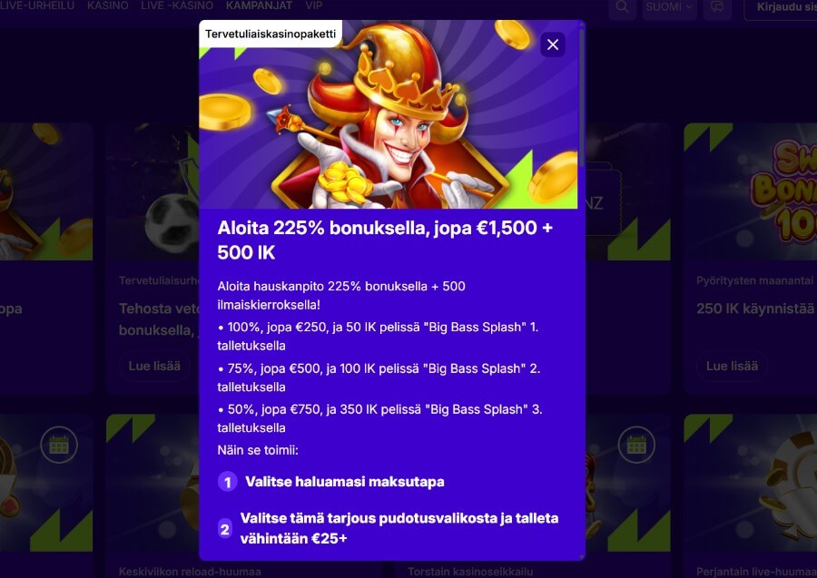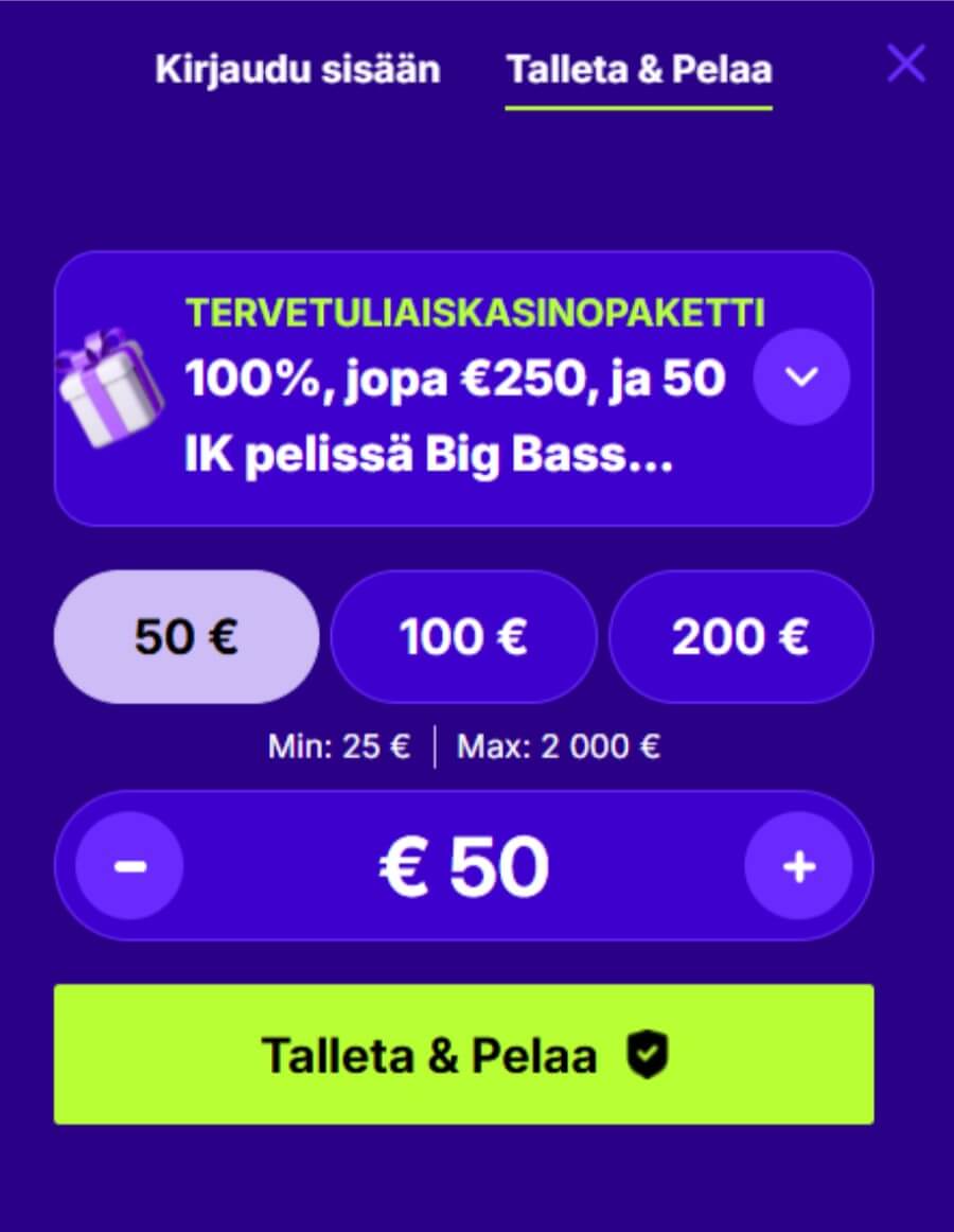 Tervetulopakettisi riippuu ensitalletuksen määrästä.